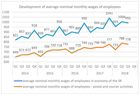 The liberalization of postal services has led to significant differences in some Member States as regards working conditions and wages offered by universal service providers and competing companies providing specific postal services. The evolution of the average nominal monthly salary of an employee in postal and courier services in the Slovak republic (SR) is below the average nominal wage throughout the economy (