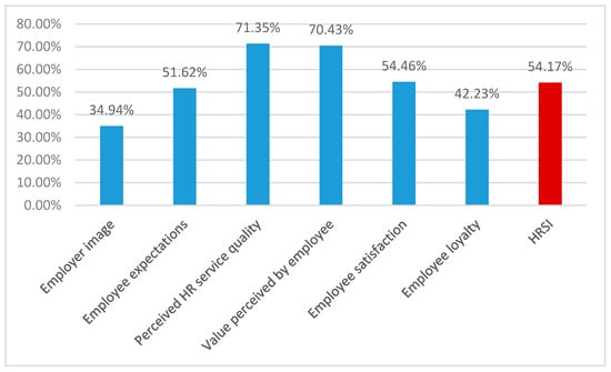 Figure 3 shows employee satisfaction index of six latent variables, and total Human Resource Satisfaction Index (HRSI). The results show that the total satisfaction of SP employees is only 54.17%. The highest satisfaction was in the perceived HR service quality (71.43%). The Human Resource Division is making great efforts to ensure quality personnel services. Personnel activities are constantly innovated, taking into account the results of employee satisfaction surveys. The lowest satisfaction was in the area of the employer image (34.94%). Every postal company, knowingly or unconsciously, creates its own image, often independently of its own will. It is necessary that the postal company take care of its image, build it up and strengthen it. Due to increasing competition in the postal market, and especially after the liberalization process, the concept of image becomes an important tool for positive perception by the individual or society [