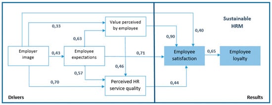 Figure 4 shows the results of correlations between individual latent variables of HRSI model. It is clear from the results that employee-perceived value has the highest impact on employee satisfaction. The coefficient 0.90 shows an almost perfect correlation. This means that the performance appraisal of the employees in relation to their workload and evaluation of the social services and benefits provided to employees significantly affects the overall employee satisfaction. However, satisfaction with performance appraisal of the employees in relation to their workload was very low (satisfaction index 47.79%). The satisfaction with the offer of social services and benefits provided to employees was much higher (93.07%). We expected that the greatest impact on employee satisfaction has the perceived quality of HR services (E1). Based on the value of the correlation coefficient (0.44 < 0.90) our expectation E1 has not been confirmed