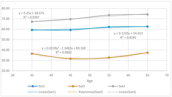 Figure 5 presents the dependence of satisfaction indicators (Sat1, Sat2, Sat3) from the employee’s age. The relationship between employee age and satisfaction with work load (Sat1) has a slightly increasing linear course (0.1235), while the determination coefficient value (R