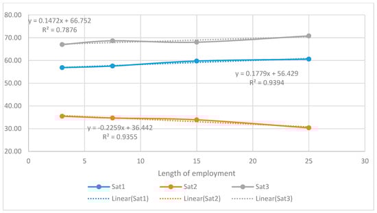 Figure 6 presents the dependence of satisfaction indicators (Sat1, Sat2, Sat3) on the length of employment for SP. The relationship between length of employment and satisfaction with work load (Sat1) has a slightly increasing linear course (0.1779), the determination coefficient value (R