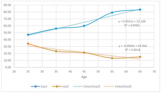 Figure 7 presents the dependence of the loyalty indicators (Loy1, Loy2) from the employee’s age. The relationship between employee’s age and loyalty to SP (Loy1) has a slightly increasing linear course (0.9541), the determination coefficient value (R