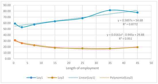 Figure 8 presents the dependence of loyalty indicators (Loy1, Loy2) on the length of employment for SP. The relationship between employment length and loyalty to SP (Loy1) has a slightly increasing linear progression (0.5897), the determination coefficient value (R