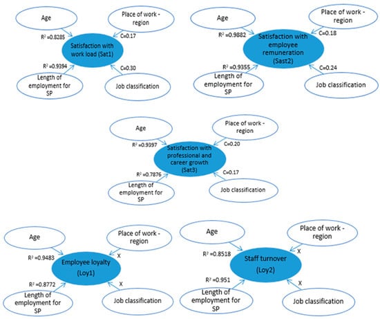 2 = 0.951). Job classification has the greatest impact on satisfaction with work load (C = 0.30); place of work—region has the greatest impact on satisfaction with professional and career growth (C = 0.20). The impact of qualitative characteristics (job classification, place of work—region) to loyalty indicators (Loy1, Loy2) has not been confirmed.