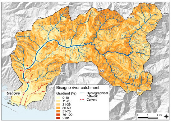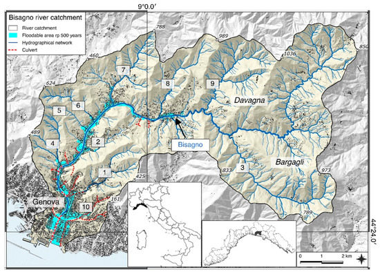 - Faccini, F.; Luino, F.; Paliaga, G.; Sacchini, A.; Turconi, L. Yet another disaster flood of the Bisagno stream in Genoa (Liguria, Italy): 9–10 October 2014 event. Rend. Online Soc. Geol. It. 2015, 35, 128–131. [Google Scholar] [CrossRef]