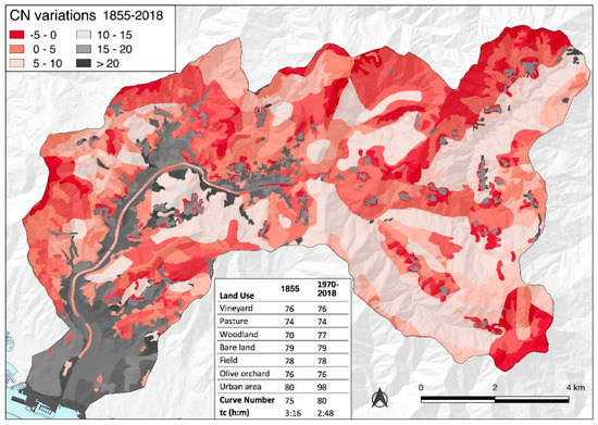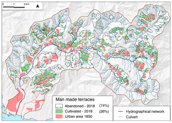 - Landscape maintenance: Small, timely and widespread maintenance interventions, particularly in the upper slope, would reduce runoff and solid transport and increase time of concentration. Given the significant reduction in the time of concentration that has occurred in the last three centuries (Figure 5), widespread interventions are almost crucial, in particular the management of terraces to avoid gullying. Access to funding should be facilitated, while specific financial rewards should be given to local stakeholders involved in sustainable landscape management policies [11]. Land use planning at the watershed level should be promoted and an authority at this level is recommended [74,75].