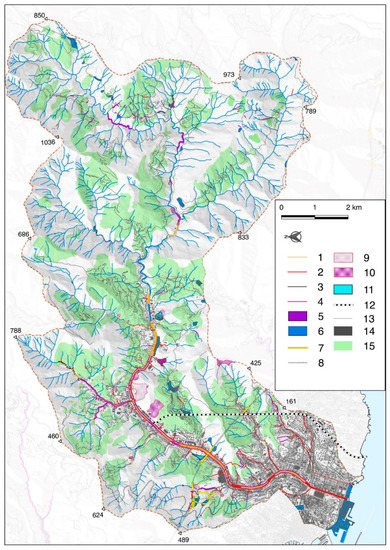 - Faccini, F.; Luino, F.; Sacchini, A.; Turconi, L.; De Graaf, J.V. Geohydrological hazards and urban development in the Mediterranean area: An example from Genoa (Liguria, Italy). Nat. Hazards Earth Syst. Sci. 2015, 15, 2631–2652. [Google Scholar] [CrossRef]