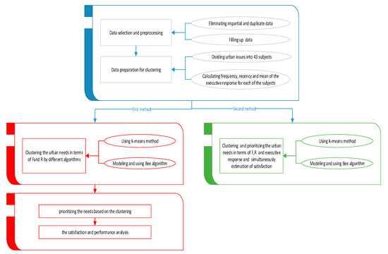 According to Figure 3, two methods were executed. In the first method, similar to previous studies [12,17], concerning the prioritization of urban needs and estimation of satisfaction, needs were prioritized. First, this it was carried out according to the two factors of frequency and recency, and then the estimation of satisfaction was performed. In the second method, the need prioritization and clustering were done based on three factors (frequency, recency and executive response mean) and the satisfaction estimation was also done simultaneously. Then, the results of the two methods of prioritization in reaching CiRM objectives were compared.