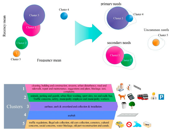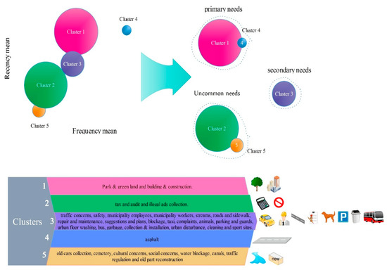 Secondary needs: Cluster 2 has a high frequency and recency, and executive response to them is high. As it was mentioned, since there are higher levels of frequency and recency and the level of executive response was lower, it demands to have top priority. However, the second cluster has a high frequency and recency, but due to the high degree of executive responses, it was placed in the secondary needs. It can be considered as the cluster where the executives have better performance; therefore, citizens were more satisfied. The municipality should pay attention to this matter. The average executive response for this group is 0.589, which is higher than any other group.