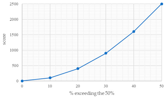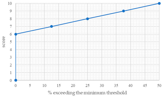 For the criteria that exceed the minimum threshold set by the CAM, two evaluation scales are identified [32]: The first has a linear course and is used for a maximum overrun of up to 50% of the minimum set by the criteria and is based on the following mathematical equation: y = 0.08x + 6 (Figure 1).