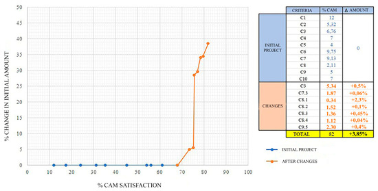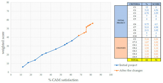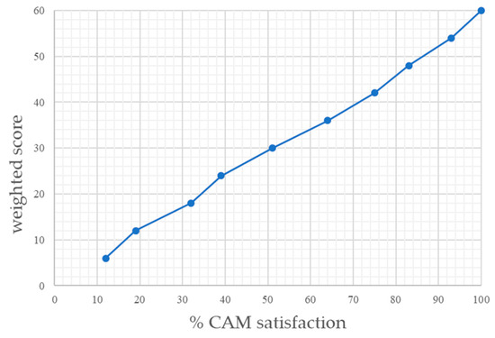 The results obtained from the previous table can be inserted on a graph, that on the axis of the abscissa, shows the percentage of satisfaction of the CAM and on the axis of the ordinates for the weighted score of each criterion. In the ideal case, the CAM are 100% satisfied and each criterion reaches at least the minimum score (i.e., 6); this situation is therefore obtained (Figure 3):
