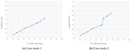 Percentage-weighted score of CAM satisfaction: (a) In the first case a percentage of CAM satisfaction of 68% is reached with a score of 42; (b) in the second case a percentage of 67% is reached with a score of 54.5.