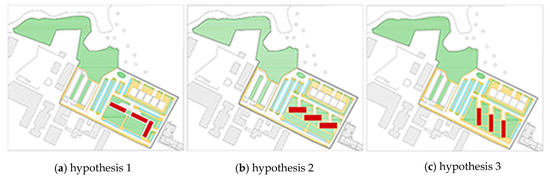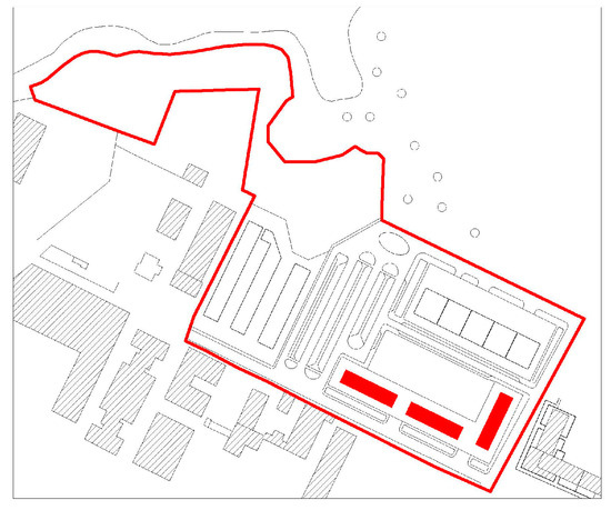 By comparing criteria with other criteria, it can be seen that the case study 1 is the one which, between the two, meets the minimum thresholds set by the CAM least, and also reaches a lower score than the second: It was decided to use the first case study as a reference for carrying out improvements. The aim was to identify a design solution capable of obtaining an improvement in the minimum environmental criteria, i.e., awards, without intervening on the type of buildings and their planimetric system. The project area is identified in Figure 5, and in particular, action is taken on the three buildings highlighted, which are the same in shape, size and planimetric system.