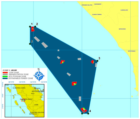 This study was conducted at Pieh marine park, one of marine protected areas in Indonesia. This area, covering around 39,900 ha, was appointed as an MPA by Decree No. Kep.70/MEN/2009 from the Minister of Marine Affairs and Fisheries. This area includes the five small islands Pieh, Bando, Toran, Pandan, and Air Island. This marine park protects coral reefs and other species that occur there, such as coral fish, dolphins, and sea turtles. The Ministry of Marine Affairs and Fisheries have issued decree No. 38/KEPMEN-KP/2014 that divides Pieh marine park into four zones: the core zone (red), eco-tourism zone (green), rehabilitation zone (grey), and sustainable fishery zone (dark blue; Figure 1). The core zone, with a total area of around 801.59 ha, is strictly limited to fish habitat protection and research. However, the rehabilitation zone, which has a total area of around 1017.01 ha, functions as an area for coral reef rehabilitation. Pieh marine park supports tourism activities in the 106.68 ha eco-tourism zone. Fishery activities are designated to take place in the sustainable fishery zone, which covers around 37,974.72 ha.