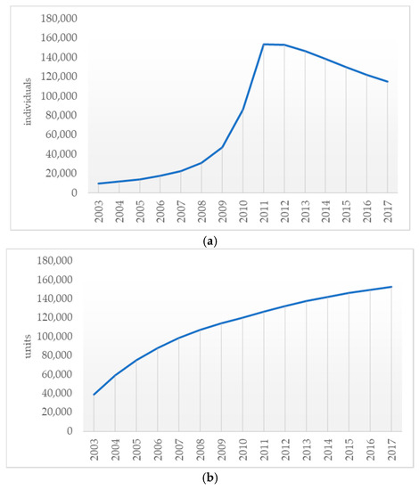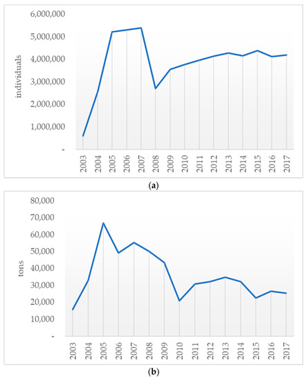 The trend of tourism and captive fishery in Padang Pariaman regency from 2003 to 2017. (Source: Padang Pariaman regency in figures). (a) The number of tourists; (b) captive fishery production (in tons).