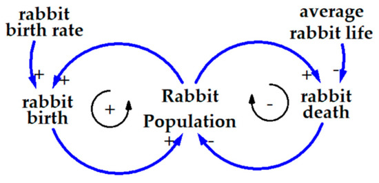 CLDs are built through the identification of system variables that are linked to each other through arrows depicting cause-effect relationships. If variable ‘A’ is connected to variable ‘B’ through a positive link a ‘+’ sign is drawn to indicate that the variables change in the same direction, i.e., if ‘A’ increases, holding other conditions unchanged, ‘B’ increases. However, two variables connected by a negative ‘−’ sign, means that they change in opposite directions. Feedback loops are drawn when two or more variables are connected in a closed cycle. Feedback loops are classified as reinforcing (R) if they propagate an initial change in one of the loop variables, or balancing (B) if the loop counteracts the initial change. For example, a CLD of the rabbit population in Figure 3 shows that rabbit births and rabbit population create a reinforcing loop, while rabbit death and rabbit population create a balancing loop. Based on a CLD, the modeler may develop a dynamic hypothesis about the causal chain of effects that may happen if a particular change occurs within a system. Assumptions of the method consider that any cause-effect relationship depicted between two variables must be read ceteris paribus [18].