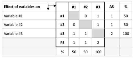 The CLD for Pieh marine park was constructed based on a literature review and then validated by stakeholders. Lopes and Videira have developed a method using a cross-impact matrix to determine which variables are relevant to a system [20]. This method involves valuing each variable’s response to other variables, where value “0” indicates that a given variable does not affect another, while value “1” indicates that a given variable does influence another. The values in rows (Active Sum/AS) and columns (Passive Sum/PS) are then summed up, with AS representing variables with more influence in the system and PS measuring how strongly a variable is affected by other variables. Variables with a high AS value can be translated into indicators of management points in the system, while variables with a high PS value can be translated into indicators of system changes. An example of cross-impact matrix calculation is shown in Figure 4. This analysis is a valuable complement to the interpretation of CLDs because all the identified variables result from a coherent analysis of the observed causal links [20]. Variables that have a high AS/PS ratio (more than 50%) would be the key variables in the system dynamics model.