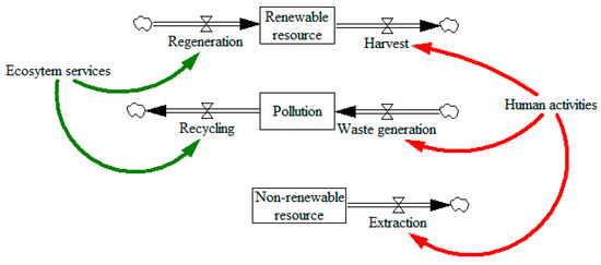 Those three conditions of sustainability can be written using a stock and flow diagram, as in Figure 5. Rectangles denote stocks, while pipes and valves denote the flows. Here, the stock of renewable resources is depleted by harvesting (e.g., fishing) and renewed by regeneration (e.g., fish reproduction). The harvest of renewables, generation of waste, and extraction of non-renewables are driven by human activity (the population and economy). Renewable resource regeneration and the processes that render waste harmless (e.g., breakdown of sewage, removal of CO2 from the atmosphere) are provided by ecosystem services [22].