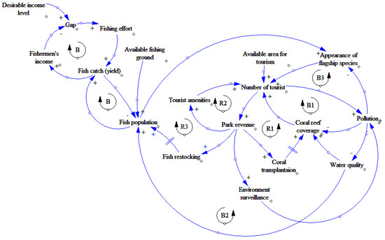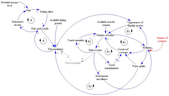 This CLD was discussed with Pieh marine park management officers to verify whether the relationship among variables is correct. The officers reported that pollution in Pieh marine park not only comes from tourists but also from residents who live along the coast. They also agreed to the removal of the ‘fish restocking’ variable because their management plan does not include fish restocking activities. The verified CLD can be seen in Figure 7.
