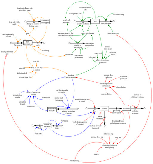 The system dynamics model of Pieh marine park. Links indicated by orange lines are for fishery dynamics, green lines for coral reef dynamics, blue lines for tourism dynamics, and red lines for pollution dynamics.