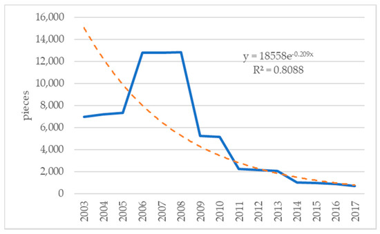 The next parameter to be defined in the fishery model is the fractional change in the number of fishing gears. From time series data of the number of fishing gears, the value of fractional change in the number of fishing gears can be estimated as −0.209, as shown in Figure 9.