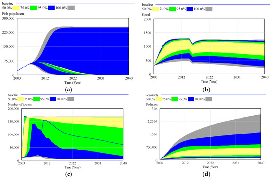 The cross-impact matrix method was implemented to determine which variables are relevant to the system (Table 1). Fish population, fishing catch, water quality, number of tourists, pollution, and park revenue all have a large AS value (>50%). These variables are therefore suitable for monitoring management actions due to their substantial impact on the system. Fish population, coral reef coverage, number of tourists, and pollution also have a high PS value (>50%), therefore representing good options as indicators for monitoring change in the system. Interestingly, the fish population, number of tourists, and pollution have a high value for both the active and passive sum and can therefore be considered key stocks in the system, while coral reef coverage is the indicator of system change.