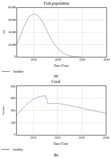 A stack and flow diagram of the system dynamics model of this study can be seen in Figure 8. This model consists of the following four sub-models; fish population dynamics, coral reef coverage dynamics, tourism dynamics, and pollution dynamics. Fish population dynamics is connected to coral reef coverage dynamics by grazing activity of fish for macroalgae, which is the competitor of coral reef. Furthermore, both fish population and coral reef dynamics are connected to tourism dynamics as the main tourist attraction. Tourism dynamics is subsequently connected to pollution dynamics as the source of waste loading. Lastly, pollution dynamics alters the water quality that modifies fish population regeneration rate and coral decay rate, reducing tourism attractiveness. Details of the model is presented in Appendix A.