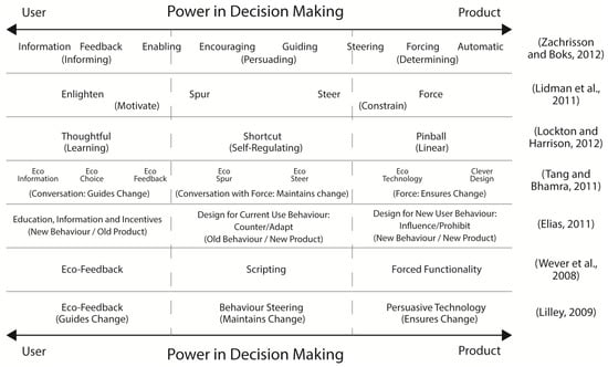 One of the earliest frameworks within DfSB studies was first proposed by Lilley et al. [], which was later detailed into seven strategies by Bhamra et al. [] using the dimension of ‘power in decision making’, or was referred to as the ‘axis of influence’ []. Later studies attempted to categorise strategies within this dimension by comparing the terminologies, as shown in Figure 1 [,]. The spectrum of this dimension mainly differentiates strategies by the distribution of control between the user and the product. One end of the spectrum uses a script to induce a behavioural change whereby power in decision making relies more on the user in action. The other end, product or artefact uses exerted force to ensure a behavioural change, avoid unintended behaviour or to ensure a change without changing behaviour, not necessarily involving a conscious decision by the user. In this case, users will be unaware of any values, incentives or rules instigated by the intervention. Gardner and Stern [] categorise this strategy as ‘efficiency behaviour’, where adoption of these products will generate certain incentives without interfering with people’s behaviour. These strategies often involve intelligent products that may have a greater impact but fail to account for ethical considerations. This is similar to what Latour [] refers to as the ‘delegation to machines’; and Norman calls ‘real affordance’ [], where they argue that undermining forces on behavioural change can be eliminated by complete delegation of all actions to the device in question; also known as ‘black-boxed script’ []. However, given the urgency of the environmental problem, Lilley, Lofthouse and Bhamra [] argue that these interventions can be necessary and provide a starting path of action, which could potentially reduce the intended impact. Nevertheless, human actions are not as predictable as a machine’s; therefore, designed inscription for inducing new behaviour may also be resisted by users who are social agents [].