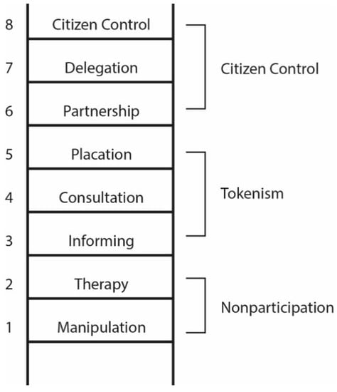 - Arnstein, S.R. A Ladder Of Citizen Participation. J. Am. Inst. Plan. 1969, 35, 216–224. [Google Scholar] [CrossRef]