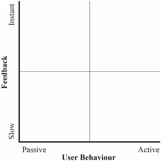 It has been suggested that the combination of influences of attitude and contextual factors, such as incentives or penalties, is much more effective at bringing about pro-environmental behaviour []. Whilst many studies have positioned the use of a ‘feedback’ feature as being a particular characteristic within the dimension of ‘power in decision making’, Backlund et al. [] proposed a two-axis matrix, where one axis represents a spectrum of frequency of feedback ranging from slow to instant; and the other axis represents user behaviour mode ranging between active and passive, as being similar to the notion of distributing control within the dimension of ‘empowerment’ (see Figure 3). Rather than having a single axis (dimension) to categorise the types of strategies, two-axis can provide better typology for strategy selection, e.g., a strategy that has slow feedback but allows the user to be more active about decision making and behaviour.
