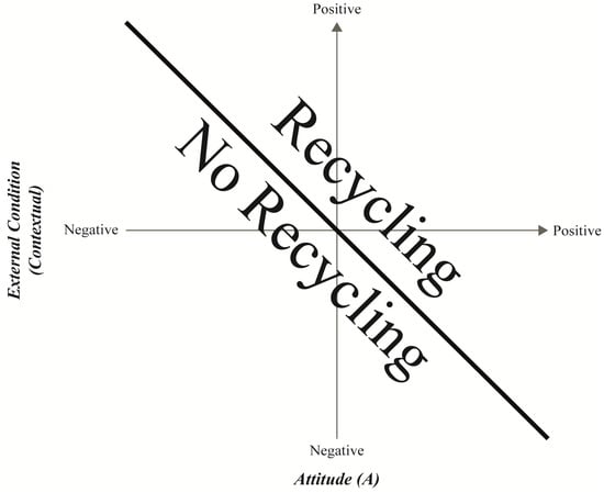 A wide range of studies have been undertaken, with empirical evidence, that highlight the need to take into account different external variables, like incentive and penalty, to overcome behavioural change resistance [,,]. Various DfSB strategies have been suggesting ways to stimulate both attitudinal and external factors affecting its behavioural determinant. This notion of encompassing both attitudinal (internal) and contextual (external) factors as determinants in bringing behaviour change originates from a psychological model called attitude-behaviour-context (ABC) [] (See Figure 4). The model advocates concerns over studies using a single variable that results in the inconsistency of end results and an incomprehensive understanding of how behaviour change occurs. However, Jackson [] explains the weakness of such an approach using an ABC model as an example of how behaviours are limited by external (contextual) factors; essentially there was no link between attitude and behaviour. Also, interventions addressing single factors are likely to be effective in the short-term, and that attitude may have a weak impact when behaviours are strongly regulated by external factors [,].