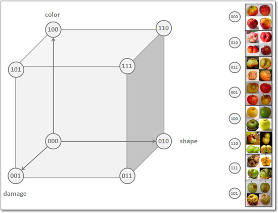 The eight apple categories included in the study according to a cubic design. Color: 0 = red (optimal), 1 = green (suboptimal). Shape: 0 = normal (optimal), 1 = odd shaped (suboptimal). Damage: 0 = no damage (optimal), 1 = damage (suboptimal).
