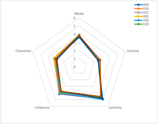 The data is scattered and some samples were perceived both mealy and juicy which might be considered contrasting. However, consumers are not trained and should not be compared to trained sensory panelists since consumers are less sensitive to differences between samples, as has been seen in other studies [20]. Jaeger et al. (1998) found that consumers considered mealiness a negative attribute for apples and associated it with an inferior texture [20]. Mealiness was also linked to a stale flavor and a less fresh apple. Bitterness was also generally a disliked attribute. In our research, all but one (110) of the significantly least liked apple categories received comparably higher scores for bitterness, meaning that the more liked apples scored lower for bitterness. These results are, however, not significant and all the apples in our study scored overall rather low in bitterness. The trend seen by Jaeger et al. (1998) was not seen for the attribute of mealiness in our data. Consumers might also struggle to notice attributes since one attribute can be easier to perceive or more dominant than others, e.g., when apples are perceived high in acidity this attribute is more dominant than mealiness, as presented by Jaeger et al. (1998) [20]. Regarding earthiness (or comparable stale flavor), some apple-category pictures scored higher than others but still scored high in liking; however, the lowest score of earthiness was, as discussed above, connected to the most optimal apple−picture category (000). Freshness has been shown to be a very important attribute for the consumer liking of apples [21]. The most liked apple in our study also scored highest in freshness, which supports the results of Péneau et al. (2006) [21], closely followed by the apples with only shape suboptimality and the green apple. The lowest scores for freshness were seen for the random apple samples served with pictures of apples that were suboptimal due to damage, categories (101), (001) and (111).