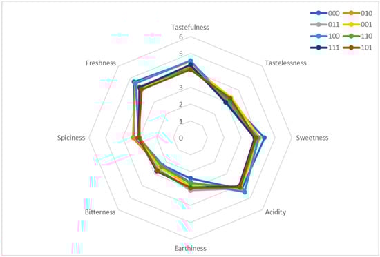 The results showed that there were no significant differences between any of the eight apple categories regarding how the consumers perceived the sensory attributes. Before the Bonferroni multiple comparison correction, there was one significant difference in perceived earthiness between the two apple categories (011) (red, odd shape, and damaged) and the most optimal apple [000], but not after. The lowest p-values for each sensory attribute separately were p = 0.8136 (mealiness), 0.8991 (dryness), 0.1813 (juiciness), 0.4133 (crispiness), 0.4994 (chewiness), 0.1878 (tastefulness), 0.5820 (tastelessness), 0.0672 (sweetness), 0.3269 (acidity), 0.0397 (earthiness), 0.2610 (bitterness), spiciness (0.5806), and 0.0544 (freshness). Note that a p-value would need to be lower than 0.05/13 = 0.0038 to be judged significant in this procedure. The results also indicated that the optimal apple category (000) was perceived as the sweetest, crispiest, least bitter, and least earthy of all categories; however, these results were not significant at the 0.05 level. In addition, the results indicated that the most bitter apple category was (111) (green, odd shape, and damaged) and that green apples were generally perceived as less sweet; however, these results were also not significant.