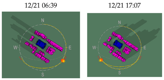 Sunlight directly affects the external radiation and indoor natural daylighting of the building, and the analysis results revealed the position that had the most sunlight, as well as shadow relationships with the adjacent buildings.