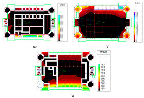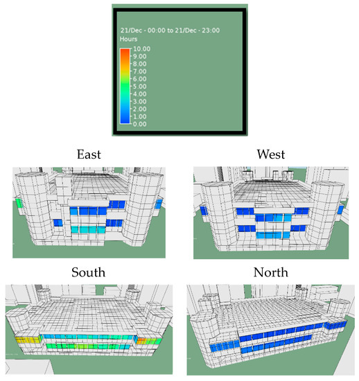 Improvements in people’s quality of life have led to an increasing emphasis on the right to enjoy sunshine [40]. The indicator used in this study was to examine sunlight during winter solstice and the effective hours of daylighting in adjacent houses (more than 1 h). According to the Taiwan’s Building Technical Regulations [41], for newly built buildings or additional constructions that exceed a height of 21 m, more than 1 h of effective sunlight during winter solstice should be ensured for the neighboring housing sites to guarantee their right to enjoy sunshine. Therefore, this indicator was adopted to discuss the relationship between the traditional market and adjacent buildings. However, because the case study involved analyzing an existing building with somewhat limited relationships with surrounding buildings, little improvement could be made in terms of sunlight. Therefore, this study only provides analysis results for the reference of subsequent reconstruction designs.