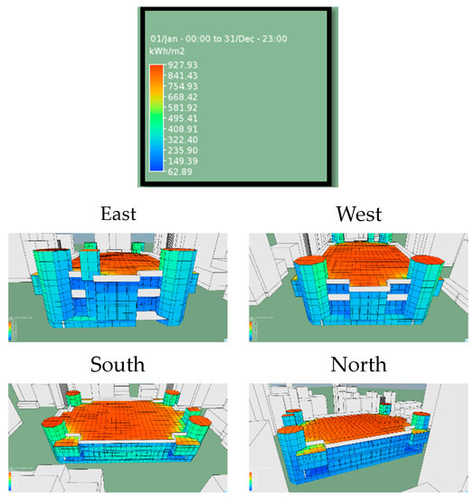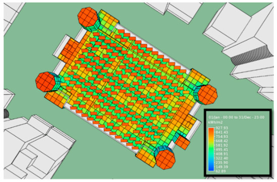 Monocrystalline solar panels were installed on the roof under the assumption that the rooftop space was fully used to predict the maximum possible generation of renewable energy. The solar panel size was set as 2 m × 0.9 m, and the IES VE default parameter was used. Future settings can be based on the product parameter of the PV system. Taiwan is located on the Tropic of Cancer in the northern hemisphere, and the location of direct solar radiation is between the equator and the Tropic of Cancer. Therefore, the solar panels were oriented southward to receive sunshine daily. Moreover, Taiwan’s latitude is between 22° and 25° north, and thus, tilting the solar panels at 25° enabled sunlight to shine directly on them during winter, thereby achieving optimal heat collection.