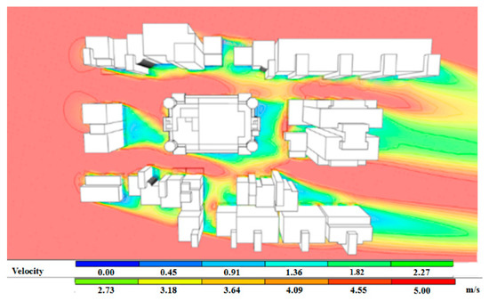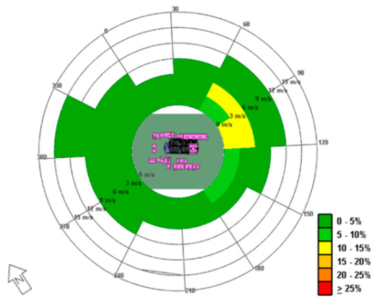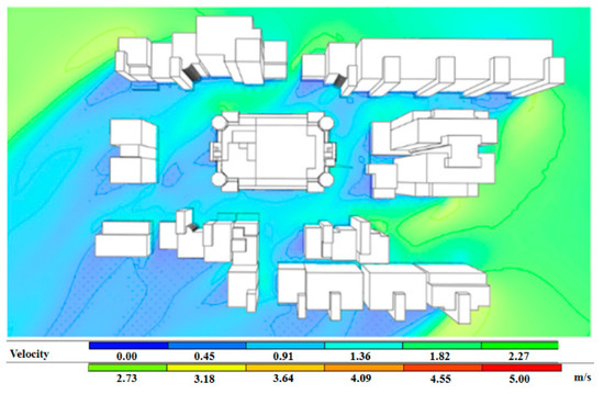 The indicators employed for the outdoor airflow condition were based on China’s Evaluation Standard for Green Building. The wind velocity of the pedestrian-level wind at 1.5 m from the ground should be less than 5 m/s. The most common annual wind direction and wind velocity based on the wind rose plot acquired from the analysis results were used to explore whether the pedestrian-level wind near the building was consistent with the specification of the indicators. Additionally, to explore the changes in pedestrian-level wind near the building under the maximum wind velocity, the wind direction of the maximum wind velocity during that year and its outdoor airflow condition were analyzed.