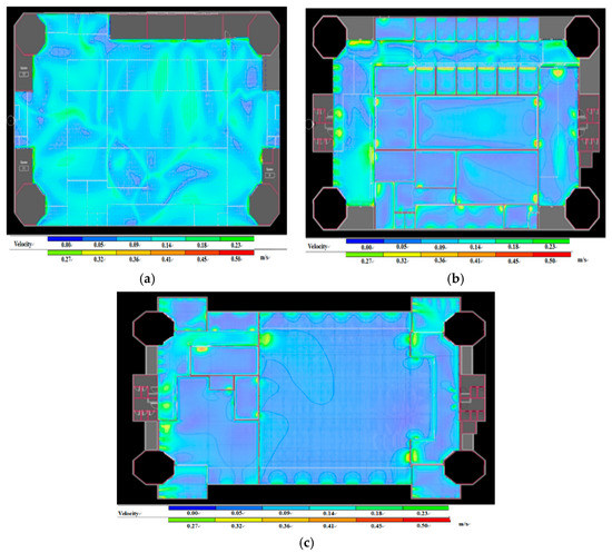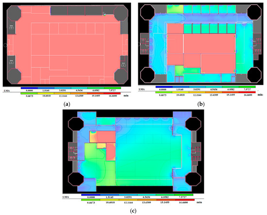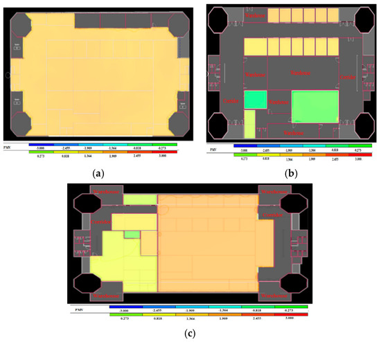 Figure 13. Indoor PMV simulation during summer solstice: (a) in the basement; (b) on the first floor; (c) on the second floor.