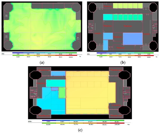 Indoor PPD (%) simulation during summer solstice: (a) in the basement; (b) on the first floor; (c) on the second floor.