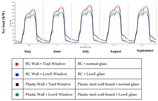 To maintain a comfortable indoor temperature for humans, the cold room load data were simulated, which represented the power that the air conditioner had to reach to maintain the indoor temperature. Xindian Central Public Retail Market is a decades-old building that uses RC structure, which is prone to heat storage, as its exterior wall material, and its windows are also normal glass without any special functions. Thus, replacing the exterior wall and window materials (four kinds of combination shown in Figure 15) can effectively reduce the energy consumption of the building’s air-conditioning system. This study used plastic steel wall boards with low thermal conductivity to reduce the generation of heat gain. Moreover, LowE glass was used as the window material to effectively block heat conduction and convection, thereby achieving the goal of energy saving.