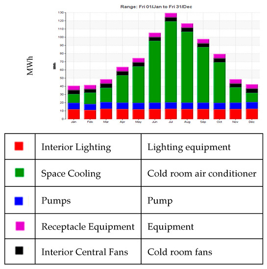 The analyzed data for cold loading and weather conditions of the TMY were incorporated into the annual energy consumption for simulation analysis, which yielded the energy consumption of the building throughout the year (Figure 16).