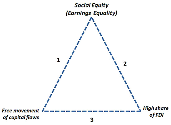 - As can be seen in Figure 2, we have positioned social equity at the top of the triangle, being the central stake of the European model of economy. This represents a “footprint” of the European model of the economy in the global landscape—aiming to reduce the development gaps between European Union countries and regions. However, this objective can be achieved in the context of the free movement of capital, but not when there is a high share of FDI companies (see Figure 3).