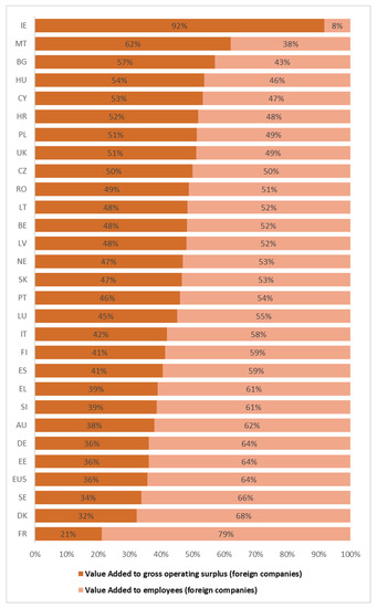 In the European Union, the share of gross operating surplus in value added at factor cost generated by foreign companies from the non-financial sector is between 21% in France and 92% in Ireland. In the most developed countries, such as Germany, United Kingdom, France, Austria and Denmark, the average of gross operating surplus in value added is around 36%, while remuneration of employees represents 64%.