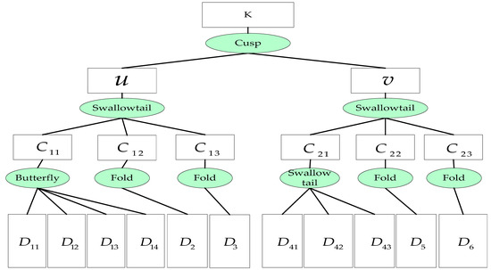 The catastrophe theory in general refers to the elementary catastrophe theory. The catastrophe model based on catastrophe theory is described by a potential function, which is determined by state and control variables, where the state variables represent the behavioural state of the system and the control variables represent various factors that influence the state variables. Let denote the system potential function, where is the state variable and is the control variable. Then, the critical point equation can be expressed as follows.