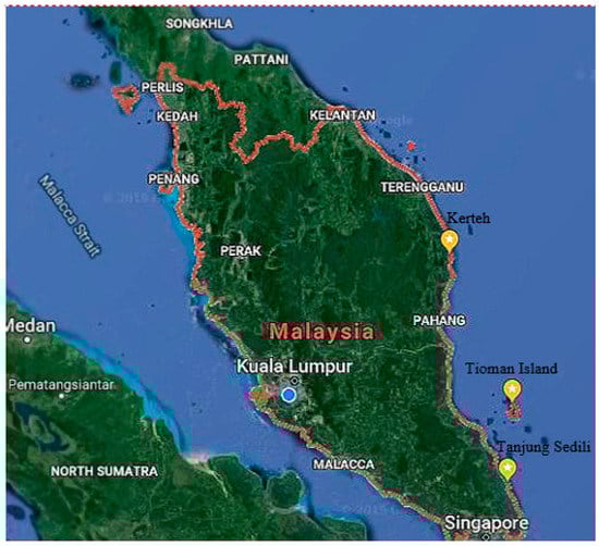 Malaysia, which is located in Southeast Asia, comprises the following two noncontiguous regions; Peninsular Malaysia and East Malaysia. Malaysia’s shoreline spans a length of more than 4800 km, and a large portion of this comprises sandy coasts (Figure 1).