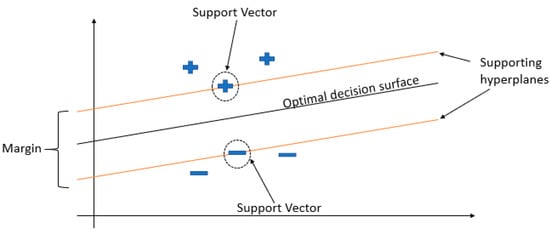 The SVM is an extensively used learning method in both the pattern recognition (classification) and regression problems. Figure 2 denotes the SVM architecture. Further, three different kernels—normalized polynomial kernel, radial basis kernel, and Pearson universal kernel (PUK)—were introduced to train the SVM model for conducting the first assessment and investigate the ability of the SVM model to mimic and learn the preprocessed data.