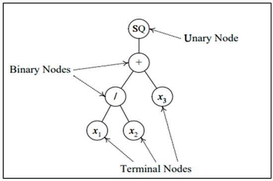GP is a programming model that mimics the biological evolution observed while handling a complex engineering problem. GP is similar to GA in most aspects; they only differ in the structure of searching for a solution. GP employs a “parse tree”, whereas GA employs bite strips [44]. GP contains two components: (i) a parse tree, which is a functional set of basic operators, including {+, −, x,/, ^, log, alog, sin, asin, exp, …}, imitating the role of ribonucleic acid, and (ii) the actual components of the functions and their parameters (referred to as the terminal set), which are obtained in accordance with the role of proteins or chromosomes in biological systems. The mathematical form of such a relation can be given as follows