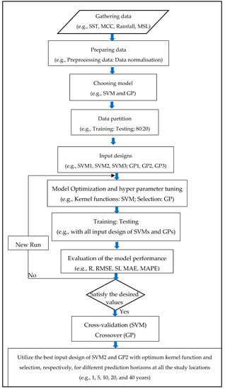 This study implemented two models—SVM and GP—with six different input design parameters. The input design parameters exhibiting a high correlation coefficient were selected for the monthly mean sea level prediction in this study and at two other study locations. Both the model performances were subsequently compared to evaluate their robustness. The highest correlation function kernel and selection of the most optimal input design were executed in different prediction horizons (i.e., 1, 5, 10, 20, and 40 years) [31,32,33] using the two proposed methods.