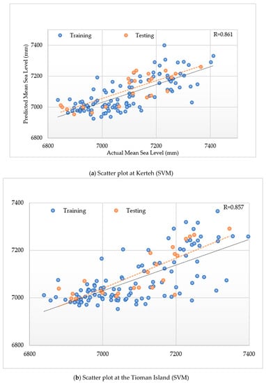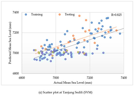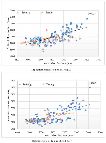 Scatter plot of the actual and predicted monthly mean sea levels obtained from the PUK of SVM modeling during the training and testing periods at (a) Kerteh, (b) the Tioman Island, and (c) Tanjung Sedili.